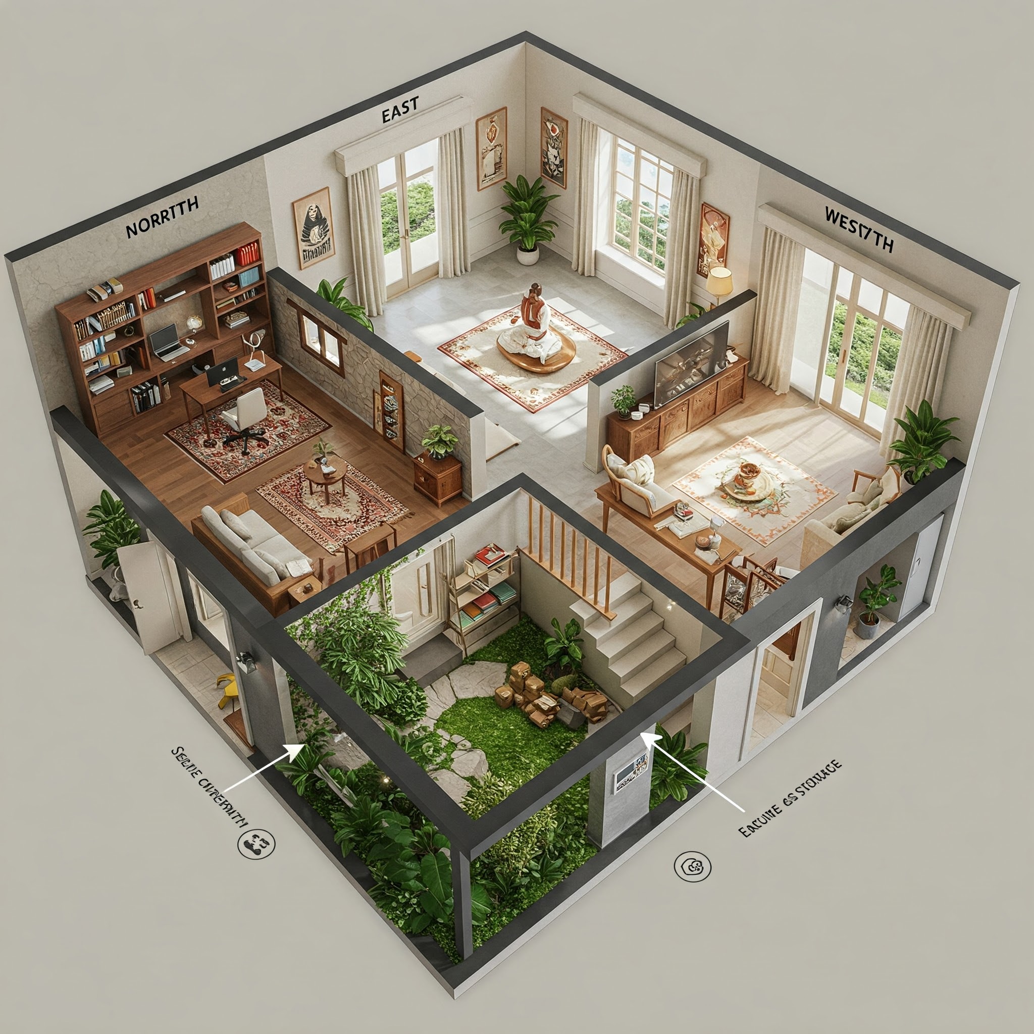 - Heavy furniture in South/West, keep center open