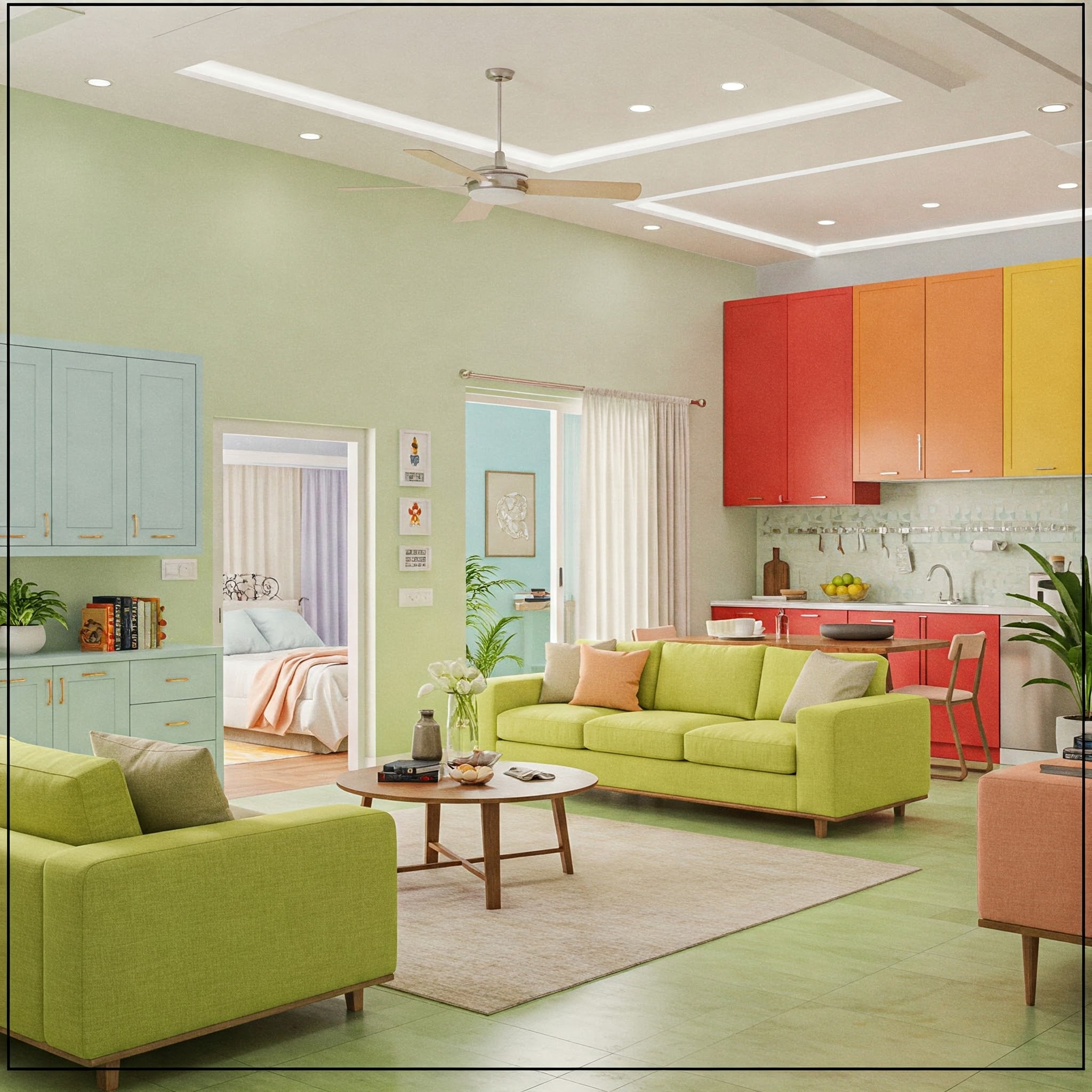 - Living Room: Light green, yellow, white colors